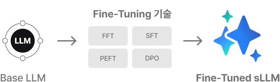 FFT(Full Fine-Tuning), PEFT(Parameter Efficient Fine Tuning), SFT(Supervised Fine Tuning), DPO(Direct Preference Optimization) 등을 활용하여 모델 성능을 고도화했습니다
